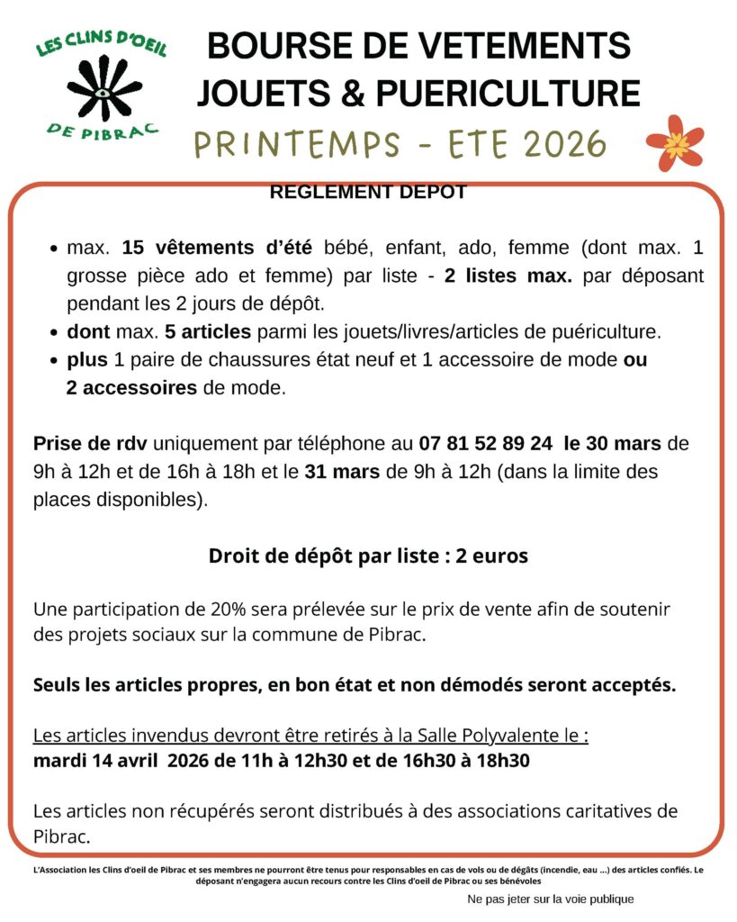 La bourse de vêtements, jouets et puériculture printemps-été 2026 organisée par Les Clins d’Oeil se tiendra le samedi 11 avril 2026 de 10h à 18h et le dimanche 12 avril 2026 de 10h à 17h à la salle polyvalente.
