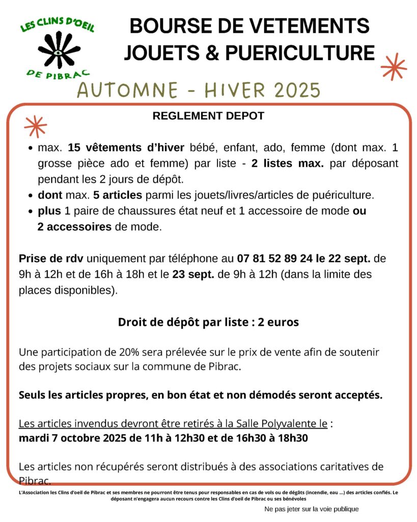 L’association Les clins d’oeil organise la bourse de vêtements, jouets et puériculture automne-hiver 2025 le samedi 4 octobre 2025 de 10h à 18h et le dimanche 5 octobre 2025 de 10h à 17h à la salle polyvalente.