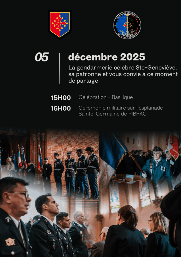 La gendarmerie vous convie à la célébration de la Sainte-Geneviève le vendredi 5 décembre 2025 à partir de 15h sur l’Esplanade Sainte-Germaine.