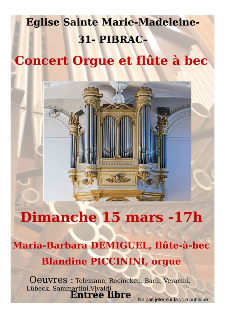Concert orgue et flûte à bec le dimanche 15 mars 2026 à 17h à l’église de Pibrac.