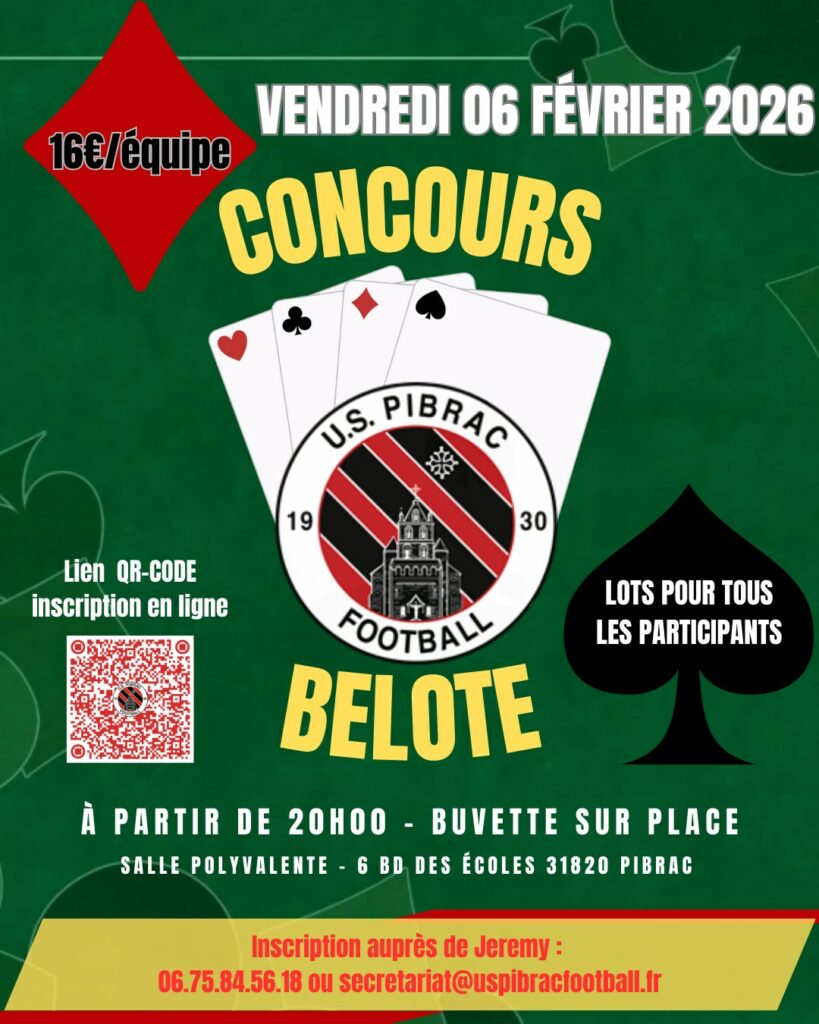 L’US Pibrac Football organise un concours de belote le vendredi 6 février 2026 à partir de 20h à la salle polyvalente.