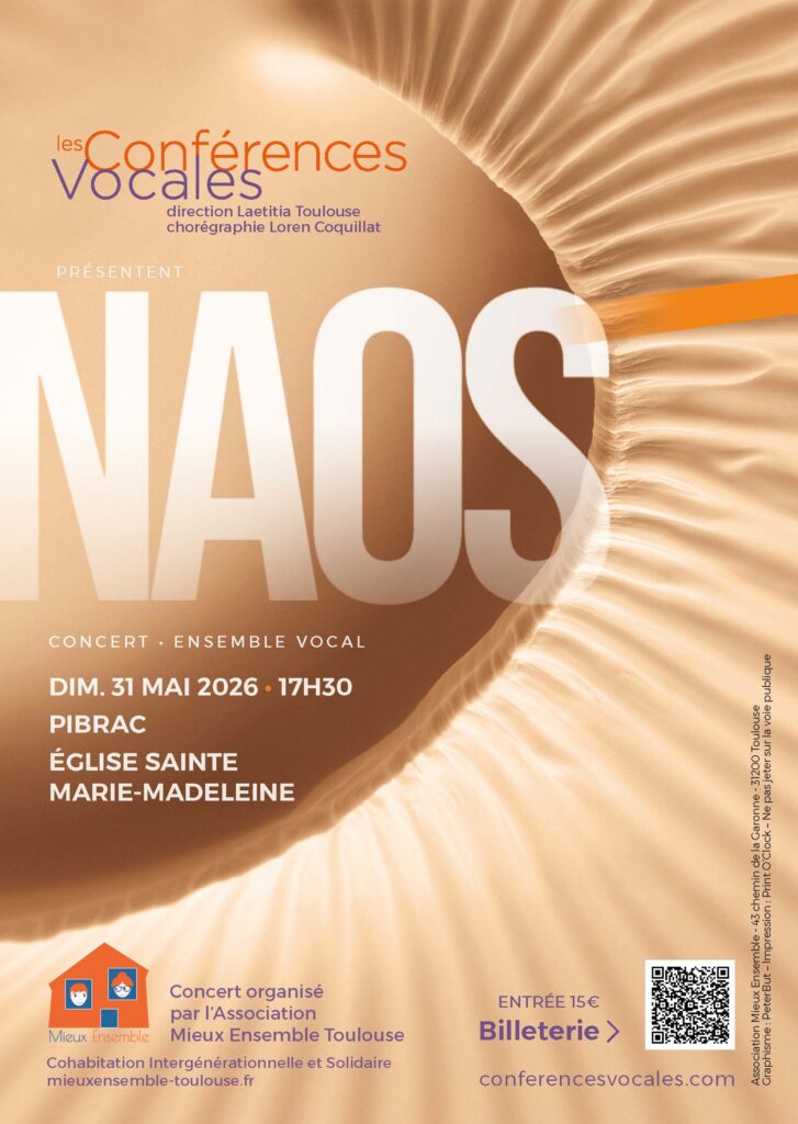 L’association Mieux Ensemble Toulouse organise un concert, Naos, avec les conférences vocales le dimanche 31 mai 2026 à 17h30 à l’église de Pibrac.
