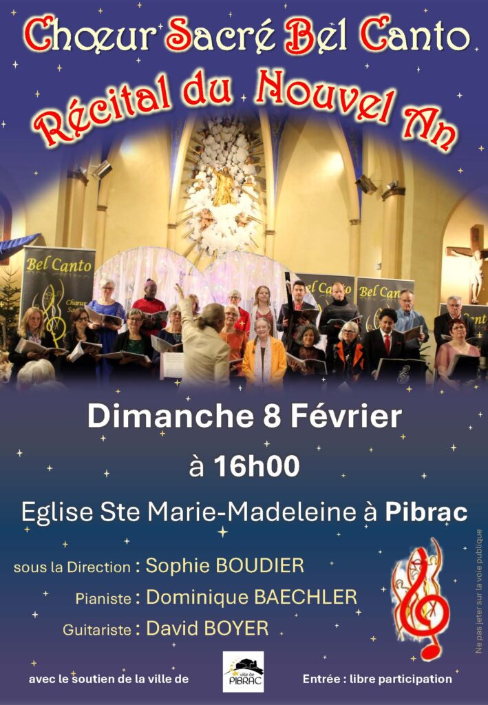 Le choeur sacré Bel Canto organise un concert le dimanche 8 février 2026 à 16h à l’église de Pibrac.