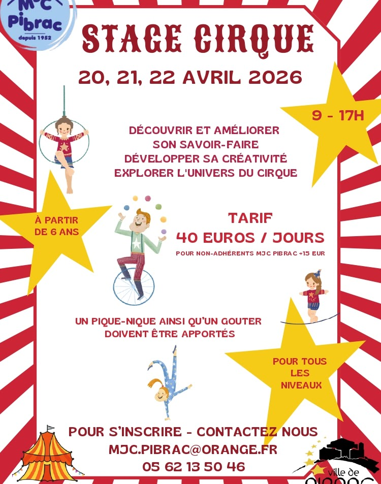La MJC Pibrac organise un stage de cirque les 20, 21 et 22 avril de 9h à 17h.