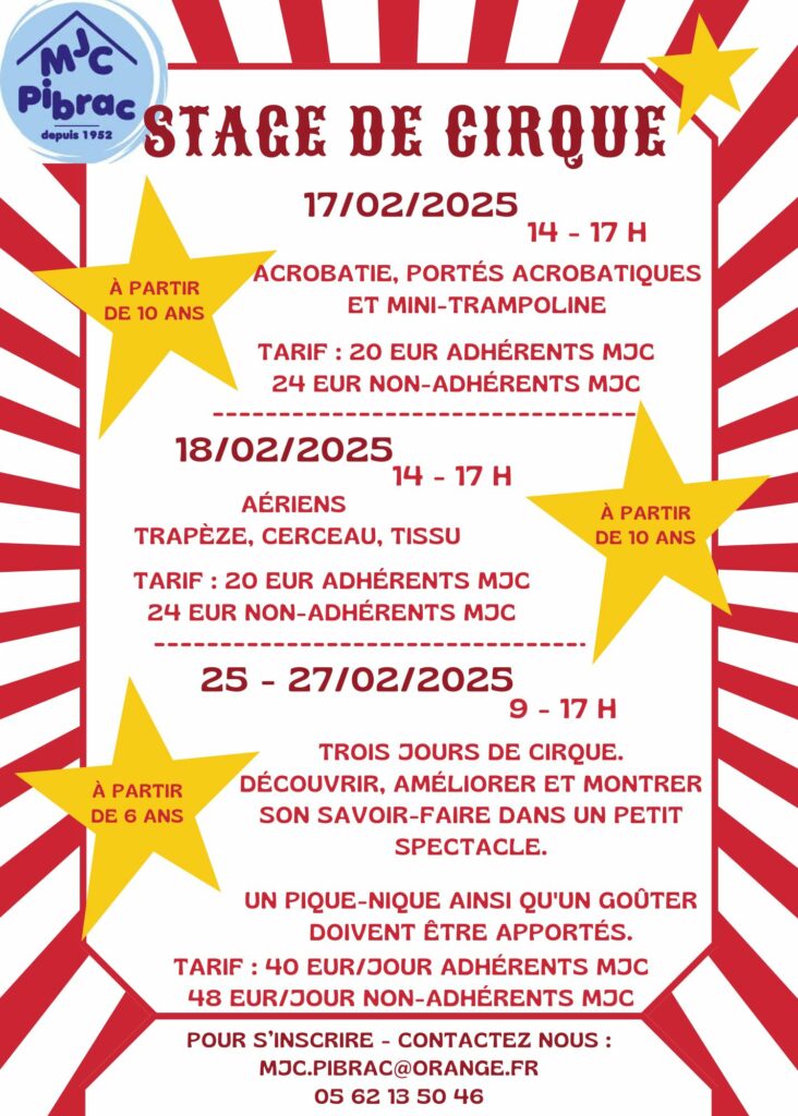 La MJC Pibrac propose un stage de cirque sur plusieurs jours pendant les vacances du 17 au 27 février 2025.
