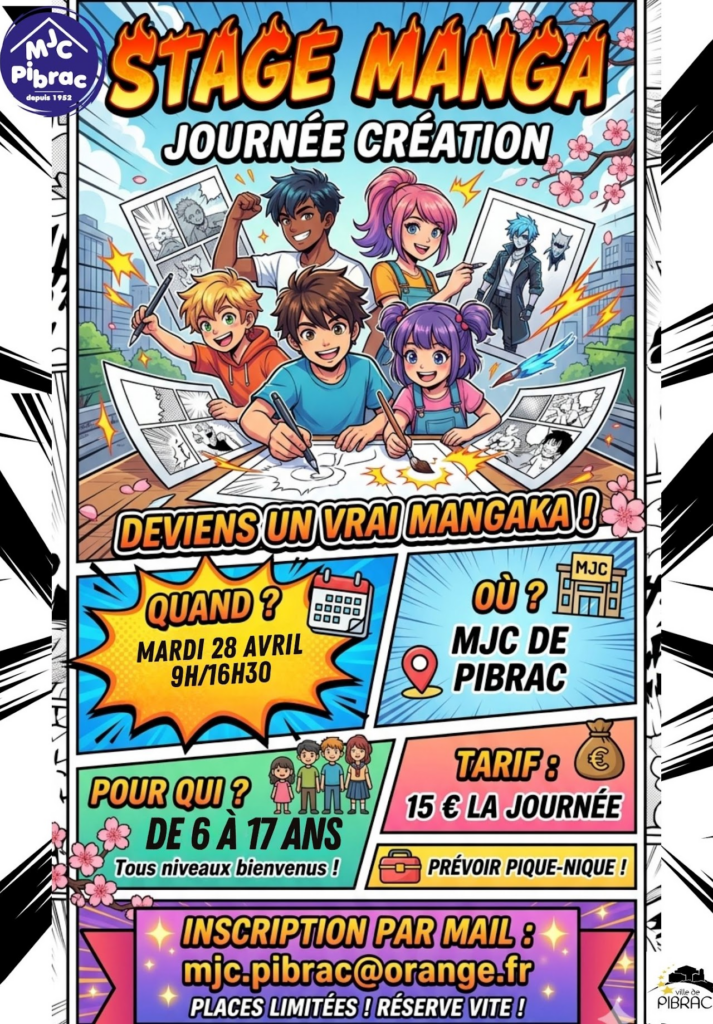 La MJC Pibrac organise un stage de manga le mardi 28 avril 2026 de 9h à 16h30 à la MJC.
