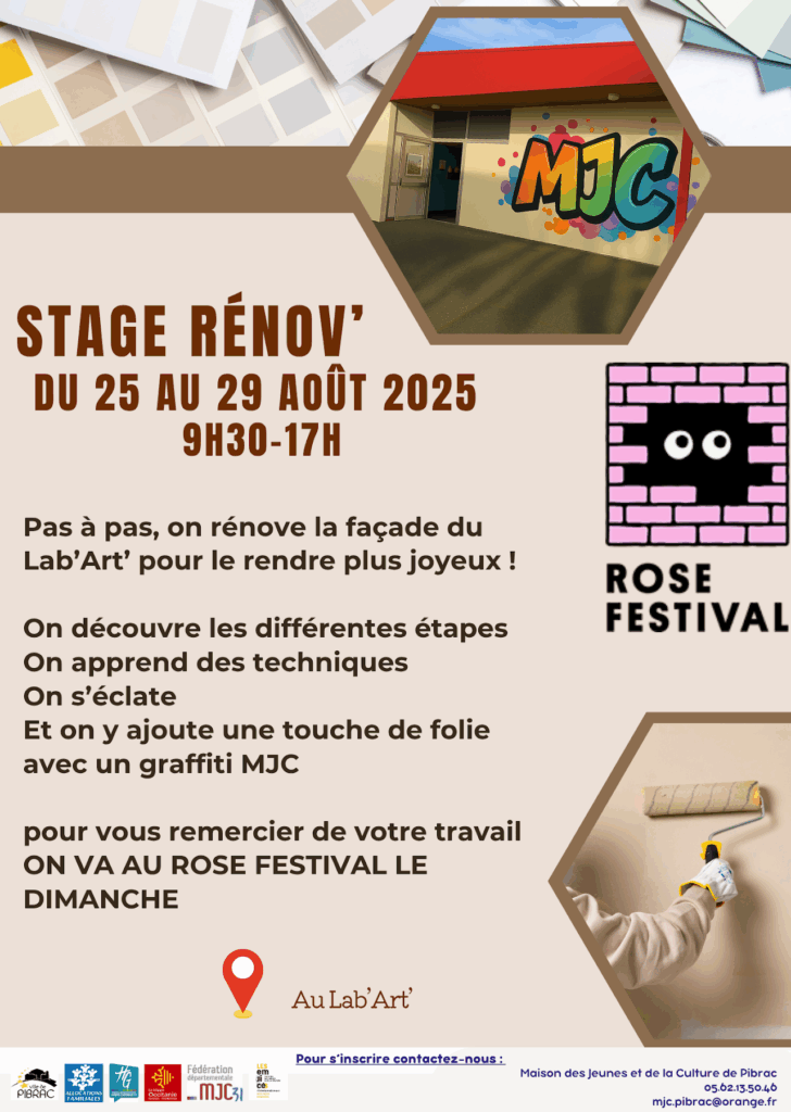 La MJC Pibrac propose un stage Rénov’ pour clôturer ces vacances d’été du 25 au 29 août 2025 de 9h30 à 17h au Lab’Art’.