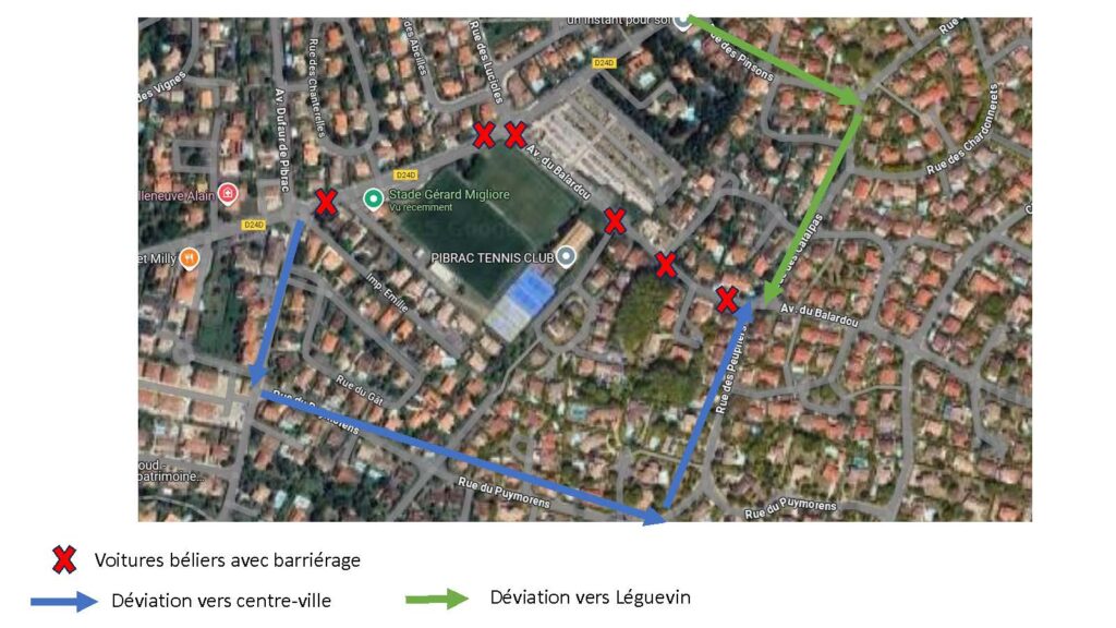 - route de Léguevin devant le stade Gérard Migliore, du rond- point du Boulevards des Ecoles et au rond-point du Conseil Municipal des Jeunes (avenue Dufaur de Pibrac et chemin du Château cru).