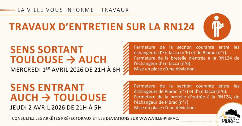 Des travaux d’entretien sur la RN124 entre les échangeurs En Jacca et Pibrac dans le sens sortant Toulouse > Auch se dérouleront le mercredi 1er avril de 21h à 6h et le jeudi 2 avril de 21h à 5h entre l’échangeur Pibrac et En Jacca dans le sens entrant Auch > Toulouse.