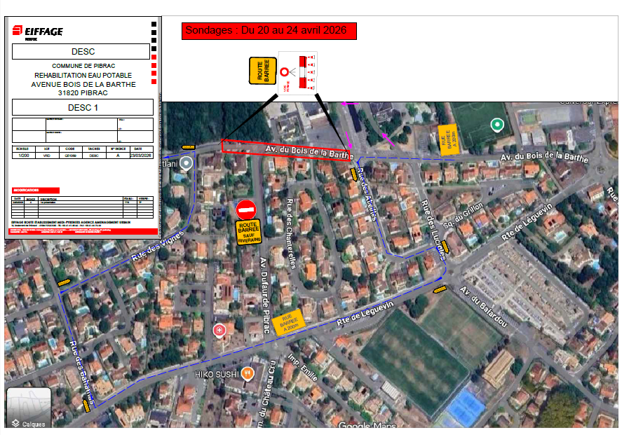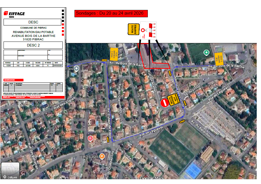Des sondages préparatoires, en vue de la réhabilitation d’eau potable à partir de juillet 2026, opèreront du 20 au 24 avril 2026 sur l’Avenue du Bois de la Barthe.