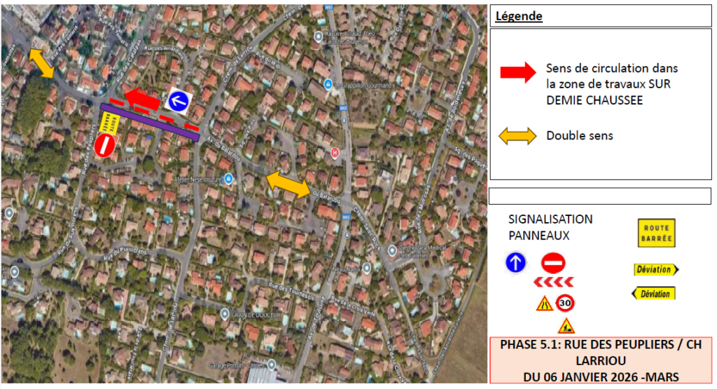 Les travaux débuteront le 6 janvier sur l’Avenue du Balardou et concerneront une portion de l’Avenue : de la rue des Peupliers jusqu’au chemin de Larriou. Les travaux seront en en demi-chaussée.