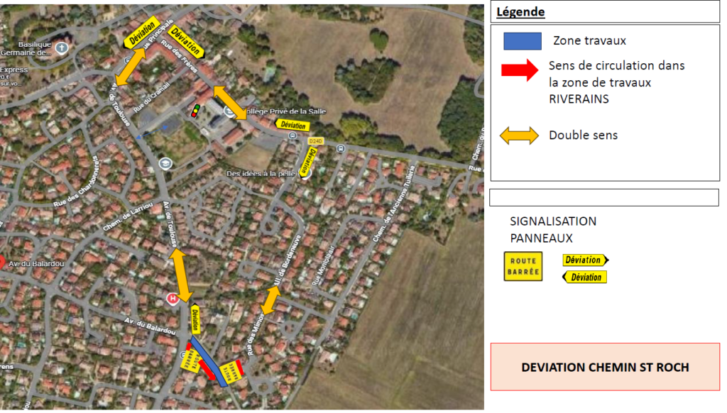 Durant les travaux, la circulation sur cette portion est en sens unique en direction de la Route de Léguevin. Mise en place d’une déviation.