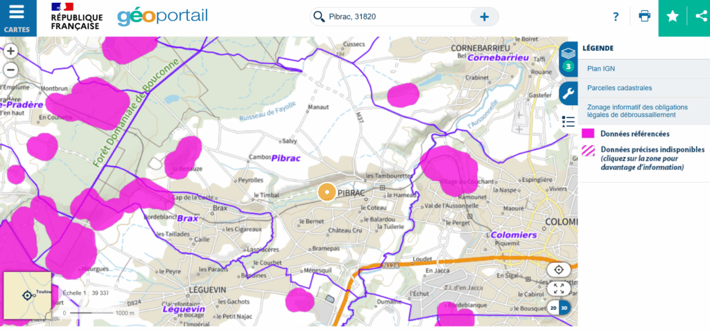 Une carte de zonage pour Pibrac est disponible sur Geoportail : www.geoportail.gouv.fr/donnees/debroussaillement